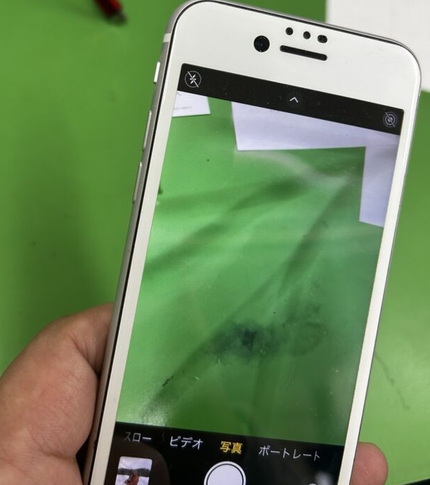 どんな問題かと言うと、画像のiPhoneないに映る映像に黒のオーロラのような模様がわかりますか?実際にはこんなオーロラはないのに映ってしまう現象です。リアカメラユニットの中で何か起きています。レンズの傷でもありませんでした。